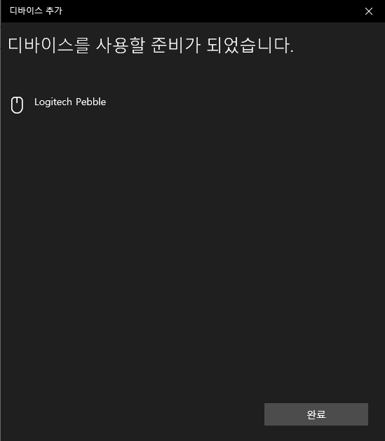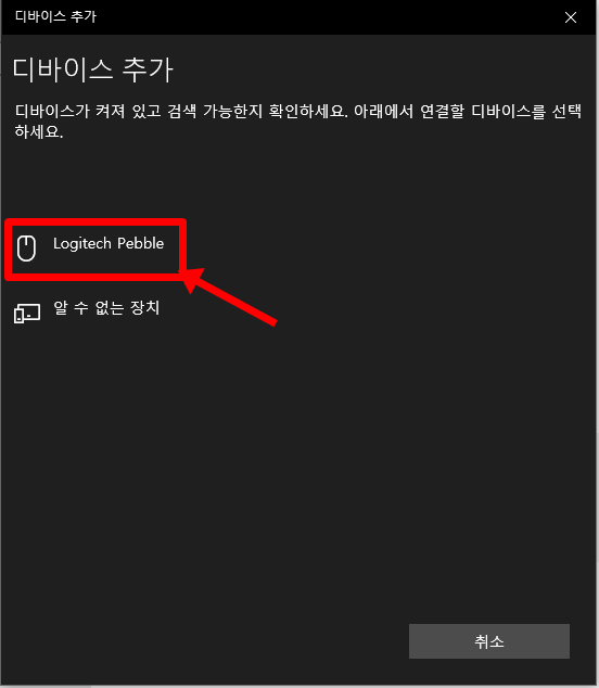 기다리다 보면 Logitech Pebble이 나옵니다. 클릭해 주면 연결이 완료됩니다.