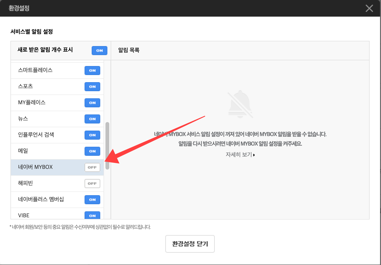 2. 네이버 MYBOX를 클릭해 OFF로 만들어 줍니다.