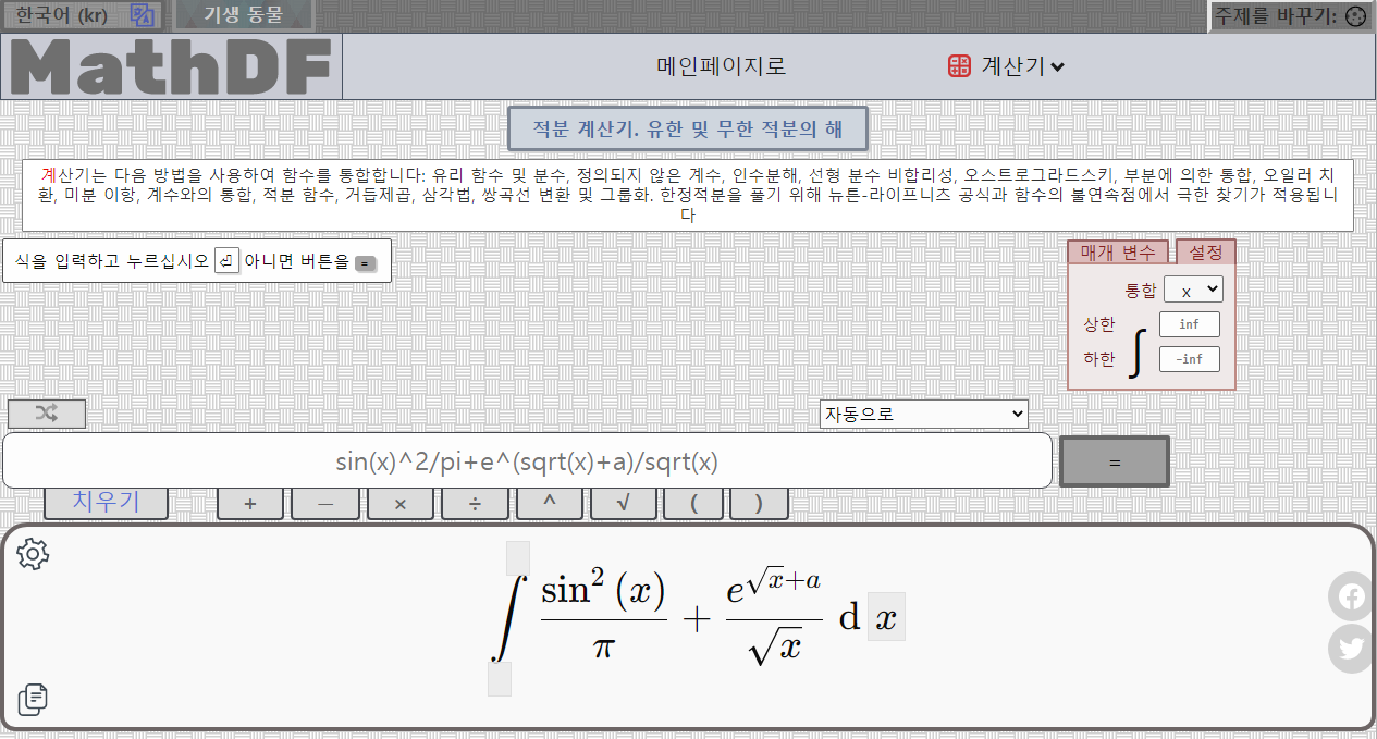 사이트에 접속하면 적분 적분 예시를 볼 수 있는 창이 뜬다. 오른쪽 위에 상한 과 하한에 숫자를 입력하면 부분 적분을 계산할 수 있다.