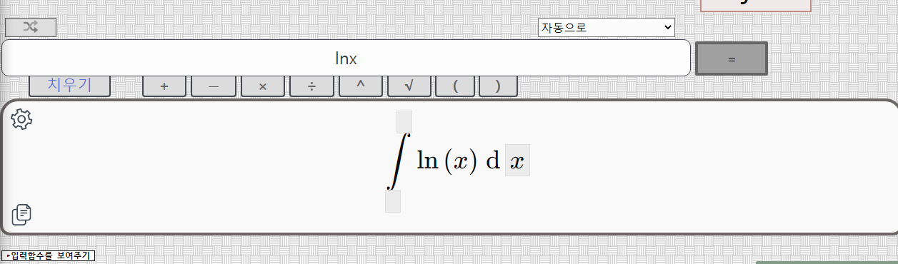 lnx를 입력해 준다. 밑에 적분과 함께 식이 나온다. 왼쪽 밑에 입력함수를 보여주기를 클릭하면 원하는 식을 찾아 넣을 수 있다.
