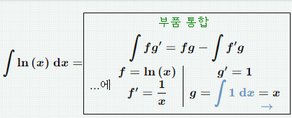 부분적분법을 이용해 ln x를 구할 수 있다. f = ln x , g' = 1 을 대입해 부분적분을 구한다.