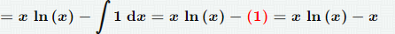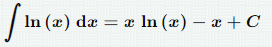 f와 g를 대신해 ln x와 1을 대입해 다음과 같은 식을 얻을 수 있다. ln x의 적분은 x ln x - x + c 가 나온다.