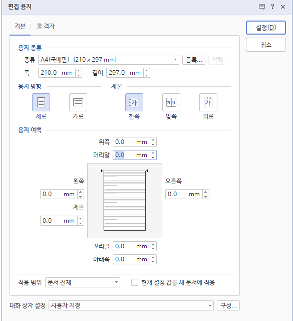 용지 여백 탭에서 현재 여백 크기를 알 수 있습니다.