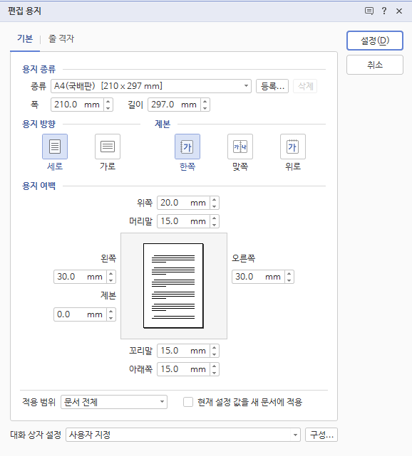 편집 - 쪽 여백 - 쪽 여백 설정으로 들어가시면 됩니다. 단축키는 F7입니다.